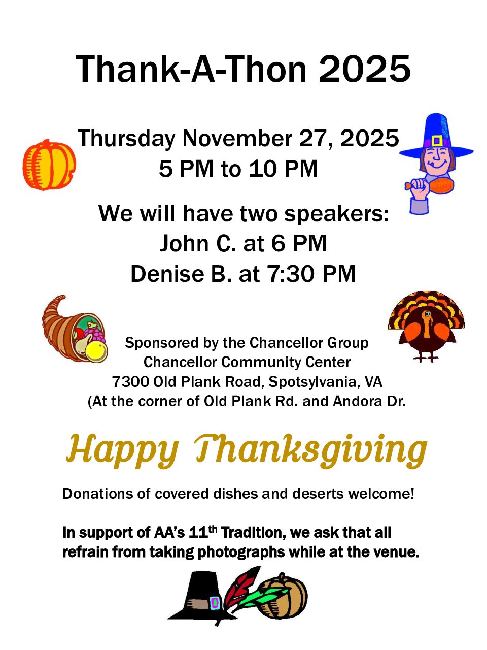Sponsored by the Chancellor Group. There will be two speakers. Donations of covered dishes and desserts are always welcome. In keeping with AA's 11th Tradition, we ask that all refrain from taking photographs or videos while at the venue during Continue reading Thank-A-Thon 2025