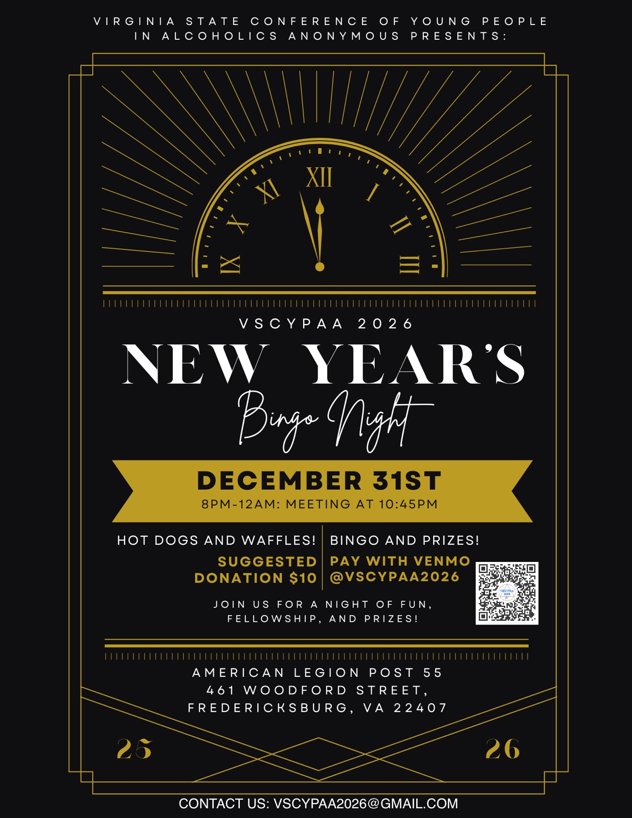 Come celebrate the 79th anniversary of Fredericksburg’s first A.A. meeting! We will have Pizza, Coffee, Soft Drinks, and Cake! Feel free to bring a side dish or dessert if you’d like.